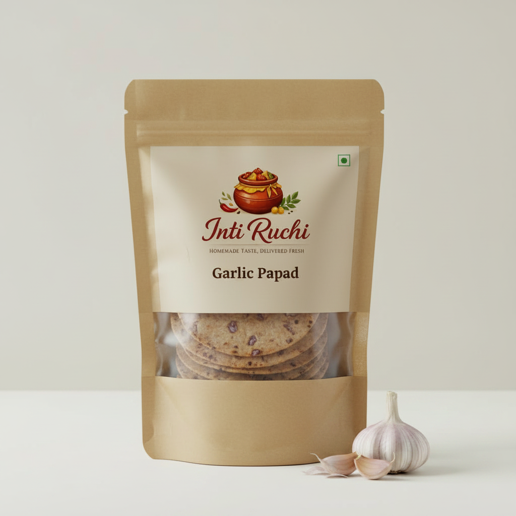 Spicy and flavorful Garlic Papad infused with rich garlic taste and traditional spices. Crispy, aromatic, and perfect as a side dish or snack for every meal.